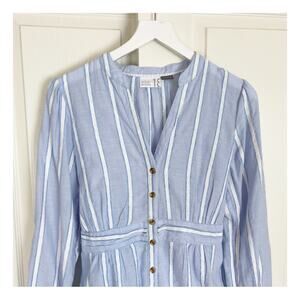 light blue / white striped l/s button down tunic top with attached tie sash from Building 18 for Anthropologie. tie sash in front or back. button front and cuff, curved hem. 60% cotton 40% poly. EUC - no flaws.