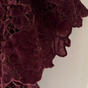 New with tags! Anthropologie Burgandy Velvet Eyelet Top. Flutter sleeves. Beautiful eyelet design is part of the fabric, trimmed to a scalloped bottom hem and sleeves. Perfect condition. Wonderful holiday top goes great with a skirt, dress pants, or jeans! XXS.