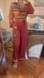 Elegant wide-leg jumpsuit with intricate floral patterns. Rich burgundy hue. Ideal for fashionable events.