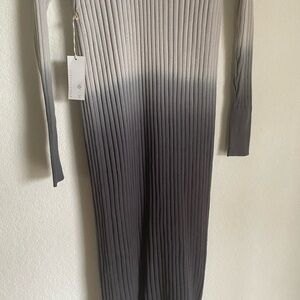 Anthropologie Burning Torch Sahara tie-dye cardigan. It features long wrist length sleeves, a ribbed knit texture, and a gradient from light gray at the top to black at the bottom