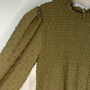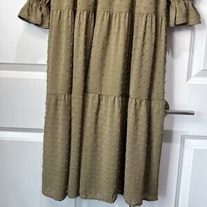 By the River size small swiss dot tiered dress. Green, lightweight quality material that can be worn in summer and layered during the fall and winter. Full Length sleeve, and lined skirt. In excellent condition. No holes or stains. From a smoke free home, see photos for measurements, material and care instructions