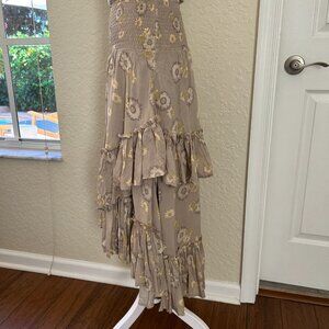 Pretty ruffled tiered high-low pull-on maxi skirt in beige with an all-over floral design and wide ruched elastic waist. Fully lined. (Can also be worn as a dress.) Fabric: 100% rayon. Measurements: length, from top of skirt to longest hemline, 37.25"; waist, 13"; hips, 25". Great condition.