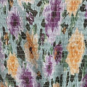 Mint green maxi with yellow and purple watercolor floral print, smocked stretch bodice, flutter sleeves, and tiered lined skirt. Lightweight and romantic.