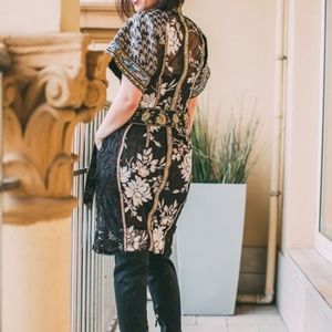 Only worn 1 time! This dress is in brand new condition. It is seriously a work of art that photos don't do justice. It is a faux wrap dress. The fabric belt and nude slip with black lace detail are also included. (Note the sleeves have a slit under them - this is how the dress is designed. Very comfy actually!)