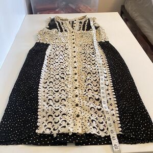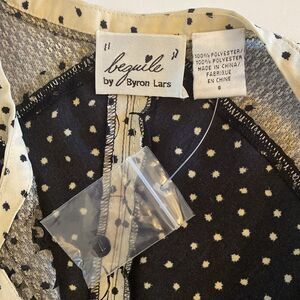 This dress from Beguile, Byron Lars exclusive Anthropologie line, offers a body conscious silhouette full of intricate laser cutting and lacework. Button front. Polyester. Black and ivory with polka dot print. Style with belt for photos but was not actually sold with a belt. Lined. Elastic side paneling at hips so stretches perfectly to fit the body.