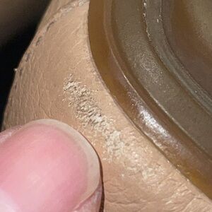 Small blemishes on heel area as seen in photos. Small spot of discoloration also noted in photos. See where my finger is pointed to.