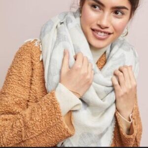 Frayed/fringed edges. Great condition, light wear, no stains, may have a few snags or loose threads.. Cozy soft gray, white, cream scarf by Anthropologie. Perfect for chilly days.