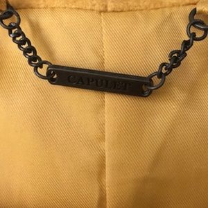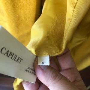 It’s hard to get a good photo, but it says that the shell is 90% wool and 10% polyester. The lining is 100% polyester. It calls for dry clean only.