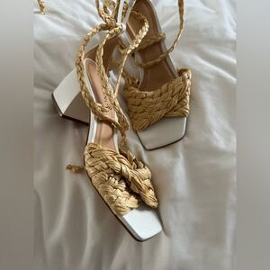 Woven raffia details and strappy ties give these block heels a bohemian flair.