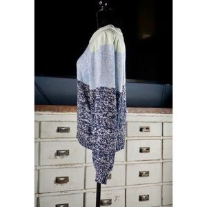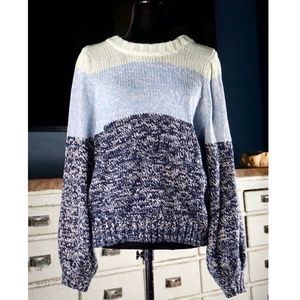A trio of different shades of speckled blue are perfectly executed on this color blocked pullover sweater.