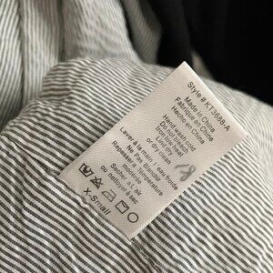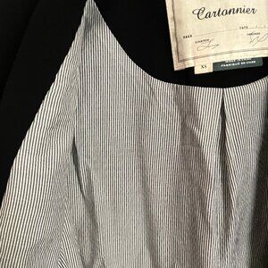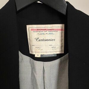 Anthropologie Cartonnier Blazer in black size XS. Relaxed fit, with front triangular drape and flat back seams, blue and white pinstripe lining. Drape front opening (no button closure) and two front flap pockets. Excellent condition, no stains or flaws. 100% polyester, lining is 51% cotton, 27% nylon, 22% polyester. Style number KT3688-A. 24" length, 28.5" length to longest point on front, pit to pit is 17", sleeve length from shoulder seam 23".