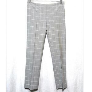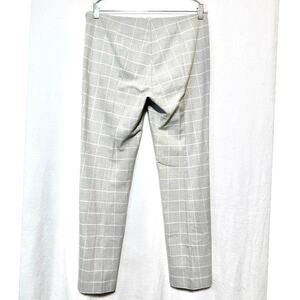 Features: hidden side zip closure, grey and white panel plaid, ankle cropped, slight pleats down front, fitted through thighs