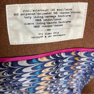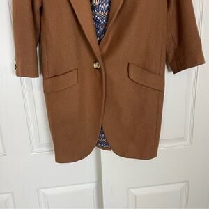 tobacco brown ( dark camel) Sienna Cocoon Coat from Cartonnier for Anthropologie. drop shoulder seam with 3/4 sleeve, pockets, single button closure. colorful print lining. 60% wool 30% poly 10% viscose. EUC - no flaws.