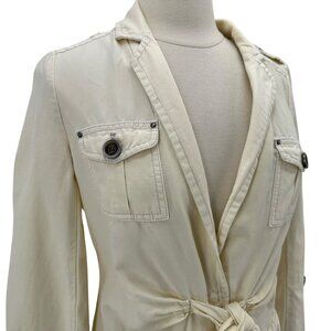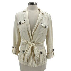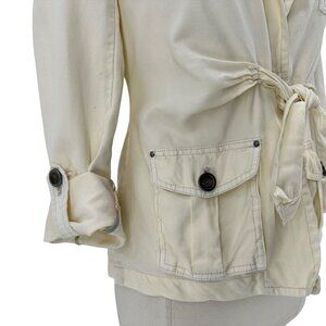 Anthropologie Cartonnier Nepal Safari Jacket - Long sleeve collared jacket - shade of ivory / off-white. One front snap button closure with a decorative front tie. 4 front button pockets. Buttons on the sleeves to wear roll-tab sleeve style. 62% Cotton & 38% Linen.