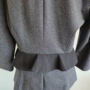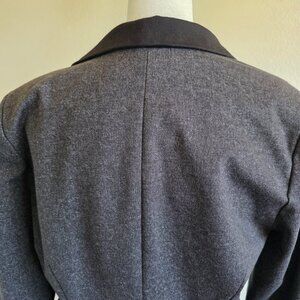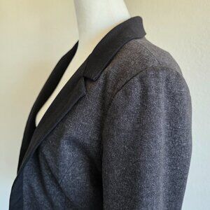 Wonderful women's blazer - jacket from Anthropologie's Cartonnier - gray body with black fabric accents - faux front pockets - lined - one hook fastening - vent back center hem