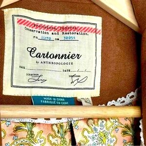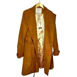 Cartonnier Anthropologie NWT trench coat is a stylish addition to your wardrobe it is made with a polyester blend microfiber fabric and features a beautiful patterned satin lining. It has three buttons closure withh a fourth at the throat for warmth. It is belted and has satin lined pockets. This mid length coat is 35 inches long PTP 16. Recommend dry clean only.