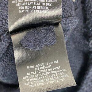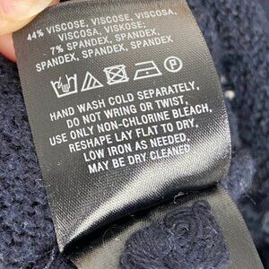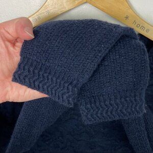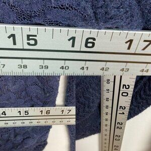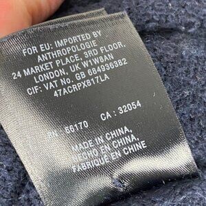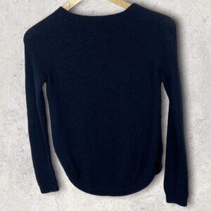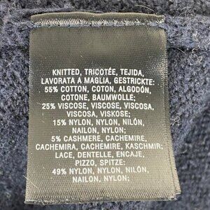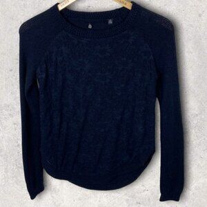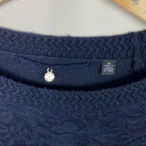 Anthropologie Knitted and Knotted Laceveil Pullover in Navy Blue and Women's Size XS. Crew neck long sleeve lace overlay sweater with rounded hem. 55% cotton, 25% viscose, 15% nylon and 5% cashmere. Hand wash. Made in China. Very good pre-loved condition. No visible flaws. Extra thread attached to care tag.