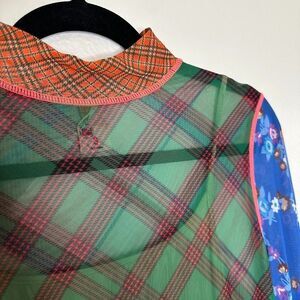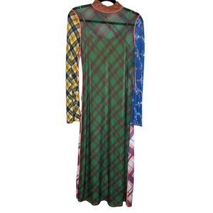 DETAILS: Sheer mesh overlay with mixed plaid patterns throughout, each sleeve and panel features different plaid design, mock neck, long bell sleeves with plaid cuffs, slip dress silhouette, midi length, stretchy mesh fabric. The pattern mixing is bold and eye-catching.