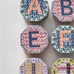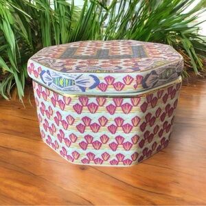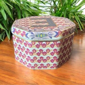 Add a pop of personality and color to your space with this beautiful octagonal lidded jar from Anthropologie, featuring a bold letter “E” on the lid surrounded by vibrant vintage-inspired patterns.