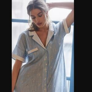Add a touch of luxurious flair to your spring wardrobe with this New Anthropologie Cezzane Striped Eyelet Dress! Boasting a unique blue and white striped pattern, contrasting camp collar and cuffs crafted with cotton and viscose, and bold button closure detail, this dress is perfect for any occasion.