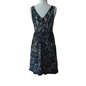 Anthropologie Champagne and Strawberry Lace Dress Sz S Overlay black Nude Flare. In great pre-owned condition
