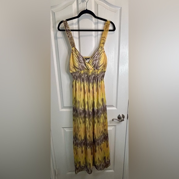 💛”Anthropologie Chaundry KC”Yellow and Brown Mixed Media Smocked Maxi SunDress🤎