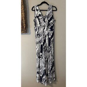 This pretty jumpsuit is from Clara Sun Moon in a misses size medium. Navy blue and white in color.