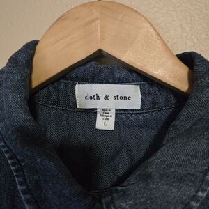 Pre-owned Anthropologie Cloth & Stone womens blue chambray button-down shirt in size large. This shirt is in good condition with normal wear and no visible flaws. Features a soft, lightweight fabric with a relaxed fit perfect for casual everyday style.