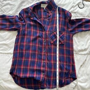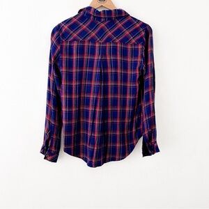Comfy plaid shirt by Cloth & Stone for Anthropologie! This long-sleeve buttondown features a collar and button-front styling. Single chest pocket, button cuffs, back pleat detail, curved hemline. The fabric has a flannel-like feel and some pilling throughout due to the brushed fabrication. Perfect Fall top!