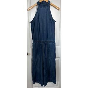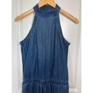 Anthropologie Cloth & Stone Bella Dahl Chambray Denim Halter Jumpsuit Womens Size XS Wide Leg Crop Frayed Pockets Side Zip