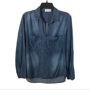 Anthropologie Cloth & Stone Denim High/Low Chambray V-Neck Blouse Tunic. Roll tab sleeve. Two front chest pockets.