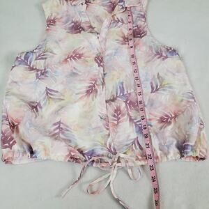 Embrace effortless style with the Anthropologie Cloth & Stone Linen Blend Top, a must-have for your women's wardrobe. This medium-sized blouse features a charming floral pattern that brings a touch of classic elegance to any casual or travel outfit. The collared neckline and sleeveless design make it a versatile choice for layering or wearing on its own during warmer months. Crafted from a comfortable blend of rayon and linen, this top ensures breathability and lightweight feel, perfect for beach outings or transitional fall and spring days. The drawstring bottom adds a modern touch to the basic style, while the button closure keeps the blouse secure. Machine washable for easy care, it's a practical piece that's as beautiful as it is functional.