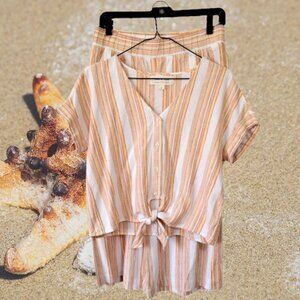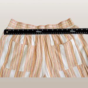 The Anthropologie Cloth & Stone Striped Crop Top and Matching Palazzo Crop Pants set is a stylish and versatile outfit perfect for travel, parties, or casual outings. Made from a comfortable and lightweight rayon and linen blend, the multicolor striped pattern adds a fun and trendy touch to the relaxed fit outfit. With features like an elastic waist, pockets, and a wide-leg design, this set is both fashionable and functional, making it ideal for the summer and spring seasons. The crop top and palazzo pants combo is a must-have for any woman's wardrobe looking to make a statement with a touch of bohemian flair.