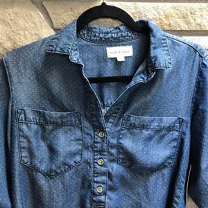 Anthropologie Cloth & Stone Polka Dot Roll Tab Chambray Pullover Tencel Shirt