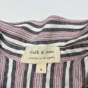 Anthropologie Cloth & Stone Striped Linen Blend Tie Front Top. White, red, blue stripes. Button down front. Slightly cropped. Cuffed short sleeve. Collared. V-Neck. Rayon linen blend. Size Small. Armpit to armpit: 19". Length: 17". (831)