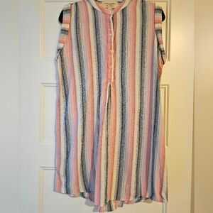 Tunic Style, Knee Length, Round Collar, Sleeveless Dress with Blue, Pink, and White Stripes and Four Button Front. 70% Cotton 30% Linen Blend. Very Cute and Comfortable. Great with Flats, Sandals, and Boots.