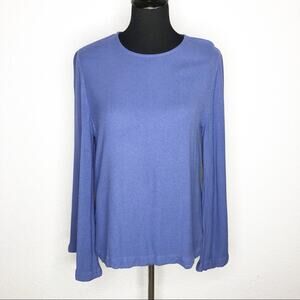 Anthropologie Cloth & Stone blue top. Pullover style with crew neck line. Long wide cuff sleeves. Keyhole opening with button at back neckline. Size small. Very good pre-owned condition. A couple of tiny marks and snags as shown. 100% viscose. Machine wash.