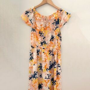 100% lightweight silk dress from Anthropologie (Vanessa Virginia brand). It's soft and lovely, very flowy and perfect for summer weddings. Worn one time only. In perfect condition with cute openings on the sleeve (see closeup photo).
