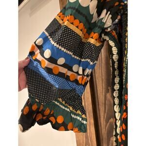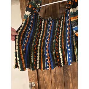 So adorable! Puff sleeves, smocked bodice, sweetheart neckline, and ruffle/peplum hem. He sleeves are a crisp cotton, but the bodice is a stretchy super soft jersey. Flattering and very comfy! Size Large.