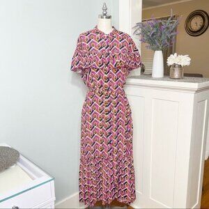 Anthropologie Corey Lynn Calter Pink Annabel Geo Ruffle Maxi Shirtdress. A bold geometric print imbues this sweetly ruffled Shirtdress with modern flare. Ruffled yoke and hem that buttons up the front and has a tie belt. Two side pockets. Midi maxi length. Like new. Size small.