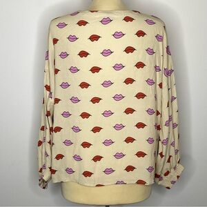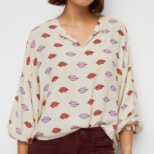 Anthropologie Corey Lynn Calter Bisous Blouse. Cream blouse with red and pink lip print. Double button closure at neckline, elastic gathered cuffs on drop sleeves. New without tags. Stock photos included to show fit.