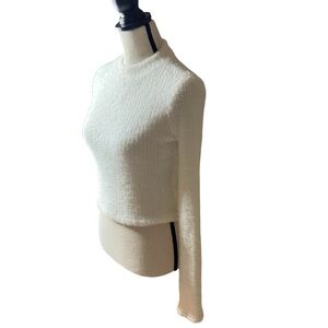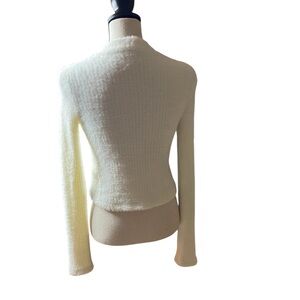 NWT Anthropologie long-sleeve sweater in a creamy soft fuzzy knit with stretch and light texture. This piece features a mock neck, ribbed detailing, and a cropped modern cut—the ultimate cozy layering piece with a minimalist luxe vibe.
