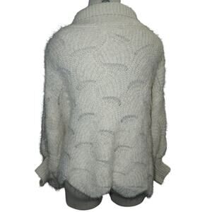 Stay cozy and chic with this Anthropologie oversized sweater poncho. Featuring a soft, fuzzy knit texture in a versatile cream color, this piece has a relaxed fit with batwing-style sleeves, ribbed cuffs, and a slouchy cowl neckline. Perfect for layering on chilly days or lounging in style.