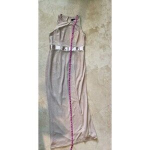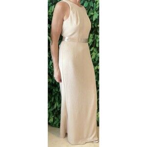 Elegant cream maxi dress. Features a sleek silhouette and side slit. Perfect for formal occasions.