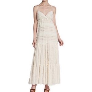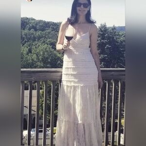 Elegant cream midi dress. Features delicate lace details. Spaghetti straps and flowing skirt.