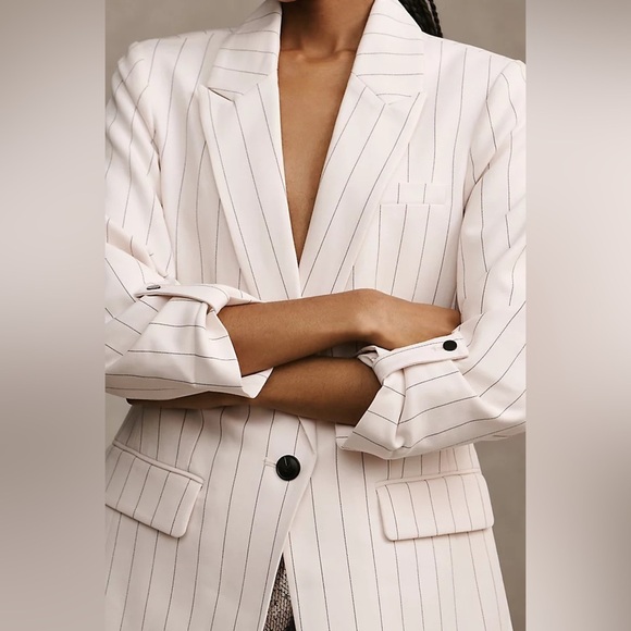 This elegant blazer from Anthropologie features a sophisticated cream and black color palette with a subtle pinstripe pattern. Its tailored fit and structured shape make it a versatile addition to any wardrobe, perfect for both professional and casual settings.