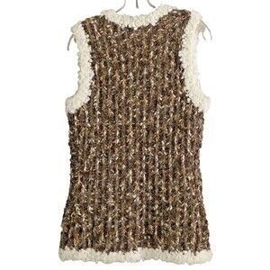 Anthropologie Curio Sweater Vest Acrylic/Wool Blend in Brown and cream, Chunky Velour Knit. Boho vibe with Faux Leather Trim, one snap closure, V-neck.