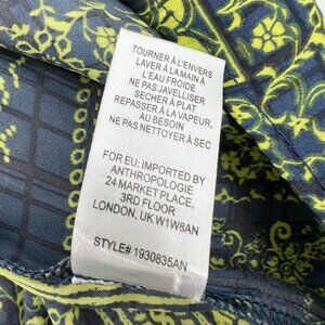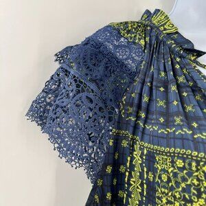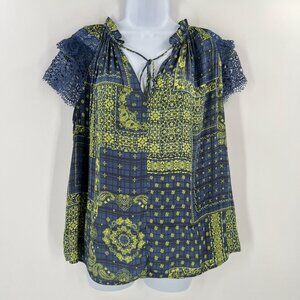 Anthropologie Current Air L Blue Patchwork Boho Blouse Ruffle Neck Lace Sleeve