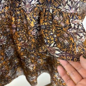 Anthropologie Current air earth tone metallic floral long sleeve multi tiered ruffle mini dress. Elegant, feminine, cottagecore. (V)