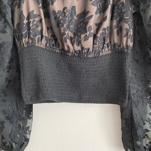 Anthropologie Current Air Smocked Black Lace Blouse Size Small NWT Whimsygoth. Current Air Anthropologie womens blouse. Square neck and square back. Long sleeves - sheer and puffy with elastic wrists. Smocked waist. Polyester and rayon fabric. Black with tan underlay. Size small. Measured laying flat: 17.25 inches from pit to pit, 16.5 inches long. New with tags.